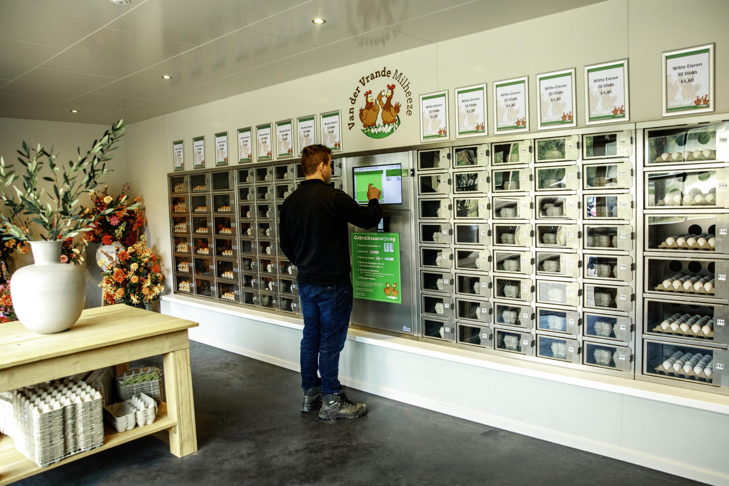 “Voorheen met een simpele kast, maar sinds juni dit jaar hebben we een automaat. Niet alleen onze eieren, maar ook onze aardappelen en uien verkopen we hier.” De eieren die niet regionaal verkocht worden, gaan via Van Beek naar de retail.